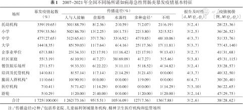 2007-2021年全国不同场所诺如病毒急性胃肠炎暴发疫情基本特征