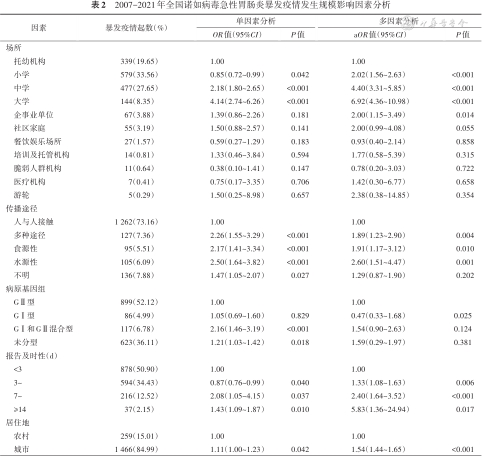 2007-2021年全国诺如病毒急性胃肠炎暴发疫情发生规模影响因素分析