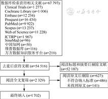 1. 文献基本特征:按限制条件检索数据库,获得文献67 797篇。剔除重复文献13 281篇,根据标题与摘要剔除52 187篇,根据原文剔除627篇,最终确定纳入研究的文献共1 702篇,其中中文文献14篇、英文文献1 688篇(图1)。