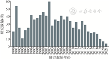 在提供了确切队列起始时间的文献(1 060篇)中,最早的队列始于1943年,最晚的始于2021年,1990年之前建立的队列较少(110篇,10.38%),1993-2002年呈现快速上升趋势,2003-2008年保持在一个稳步上升的阶段,2008年以后开展的研究数量呈现下降趋势,2016-2020年仅有75项(7.08%)(图2)。