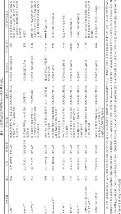 注:ABC:孤独症出生队列;MoBa:挪威母亲和儿童队列研究;SCQ:社会沟通问卷;BASIS:英国婴幼儿孤独症同胞研究中心;ALSPAC:父母和儿童埃文郡纵向研究;PLASC:年度小学生学校普查;SYC:瑞典斯德哥尔摩青年队列;DSM-Ⅳ:精神疾病诊断和统计手册第四版;ICD-10:国际疾病分类第十次修订版;Generation R:R世代研究;CATSS:瑞典儿童和青少年双生子研究;A-TAC:自闭症-抽动症、多动症和其他合并症清单;DNBC:丹麦国家出生队列;BBC:美国波士顿出生队列;M-CHAT:改良版婴幼儿孤独症筛查量表;SAT:孤独症样行为;a截至2010年的样本量,研究对象持续招募;b截至2020年9月的样本量,研究对象持续招募