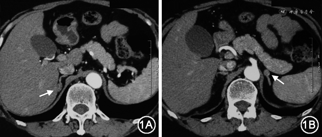 体格检查:体温36.3 ℃,脉搏86次/min,呼吸19次/min,卧位血压115/68 mmHg,立位血压102/67 mmHg。未见紫纹及瘀斑等异常体征。实验室检查:血钾正常3.93 mmol/L,血钠正常140.6 mmol/L,血二氧化碳正常29.7 mmol/L,血钙、磷正常;尿钾、钠、钙、磷正常。血、尿、便常规正常,肝功能、肾功能、凝血及肿瘤标志物正常。血糖、糖化血红蛋白、甲状腺功能、性腺激素、脱氢表雄酮正常。24 h尿醛固酮14.7 μg/24 h(1.19~28.10 μg/24 h)(括号内为正常参考值,下同),24 h尿游离皮质醇(UFC)332.3 nmol/24 h(98.0~500.1 nmol/24 h),促肾上腺皮质激素-皮质醇(ACTH-F)节律0点皮质醇356.09 nmol/L(0~165.7 nmol/L),午夜1 mg地塞米松抑制试验晨8点皮质醇55.69 nmol/L。血甲氧基酪胺<24 pmol/L(≤100 pmol/L),甲氧基肾上腺素98.8 pmo1/L(≤420.9 pmo1/L),甲氧基去甲肾上腺素138.5 pmol/L(≤709.7 pmo1/L)。肾素-血管紧张素-醛固酮系统评估,体位试验:卧位/坐位2 h/坐位4 h的直接肾素浓度(PRC)1.3/3.3/3.8 mU/L、血浆醛固酮浓度(PAC)27.2/28.0/24.7 ng/dl(1 ng/dl=27.7 pmol/L);坐位2 h的血浆醛固酮与肾素活性比值(ARR):8.5(阳性判断标准:ARR≥3.7[1]),提示该患者原发性醛固酮增多症(primary aldosteronism,PA)初筛阳性,醛固酮瘤可能(坐位4 hPAC较卧位PAC不升反降[2])。进一步行确诊试验:生理盐水试验前PAC为21.3 ng/dl,试验后PAC为13.8 ng/dl(阳性判断标准:试验后PAC>10 ng/dl[1]);卡托普利试验前PAC、PRC分别为17.5 ng/dl、3.1 mU/L,口服50 mg卡托普利片2 h后PAC、PRC分别为15.4 ng/dl、5.6 mU/L(阳性判断标准:试验后2 h PAC>11 ng/dl[3])。该患者确诊试验均支持PA。影像学检查:肾上腺增强CT(图1):双侧肾上腺小结节,考虑良性,皮质腺瘤可能性大。
