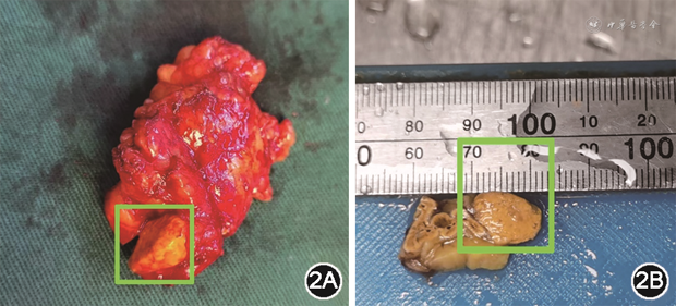 2022年6月患者于解放军总医院第一医学中心泌尿外科行后腹腔镜左侧肾上腺腺瘤切除术,术后大体标本:淡黄色组织1块,大小3.5 cm×2.7 cm×0.3 cm,切面淡黄色,于一侧见一金黄色结节(肾上腺腺瘤),大小1.2 cm×1.1 cm×1.0 cm,切面金黄色实性质中,与周围组织分界较清,局部临床已剖开(图2)。组织病理学示左侧肾上腺皮质腺瘤。免疫组织化学染色示黑色素A(melanA)(部分弱+),中枢神经特异性蛋白S-100(-),嗜铬粒蛋白A(CgA)(-),突触素(Syn)(+),增殖细胞相关核抗原Ki-67(+3%),抑制素-α(inhibin-α)(+),细胞角蛋白(CK)(-)。术后患者停用降压药、未补钾,监测血压:104~129/64~80 mmHg,血钾4.09、3.58、3.91 mmol/L;体位试验:(卧位/坐位2 h/坐位4 h)PAC 1.6/2.9/3.1 ng/dl,2 h ARR为0.8;ACTH-F节律、24 h UFC未见异常;外周血非卧位类固醇激素谱:PAC<0.02 μg/L(<0.220 μg/L)。复查肾上腺CT平扫:左侧肾上腺腺瘤切除术后,术区脂肪间隙模糊,见短条状高密度影;右侧肾上腺内侧肢见大小约15 mm×8 mm稍低密度结节。根据原发性醛固酮增多症手术结果(PASO)研究的评价标准[7],患者达到临床和生化完全缓解。