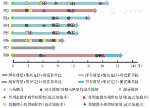 最常见的3~4级血液学不良反应为中性粒细胞减少(3例),非血液学不良反应为纤维蛋白原减少(1例)和肌酸激酶升高(1例)。最常见的1~2级血液学不良反应为血小板减少(4例)和中性粒细胞减少(2例),非血液学不良反应为出血(3例)、斑丘疹(2例)。Ven爬坡过程中均未发生TLS。6例患者在治疗过程中因AE调整剂量或停药:3例(例3、例6和例7)分别因咽部出血2级AE、皮下血肿2级AE、斑丘疹2级AE短暂停用泽布替尼6 d和奥布替尼15 d、2 d;1例(例4)因服用伊布替尼后出现阵发性房性心动过速2级AE、肌酸激酶升高3级AE和高磷酸血症2级AE,伊布替尼减量至280 mg后仍不能耐受,改为泽布替尼未出现不耐受;1例(例8)因持续中性粒细胞减少4级AE将Ven减量至300 mg每日1次维持治疗并间断应用粒细胞集落刺激因子支持;1例(例5)因持续中性粒细胞减少4级AE将Ven减量至200 mg每日1次维持治疗,后因纤维蛋白原降低3级AE及血便2级AE而停用泽布替尼16 d。