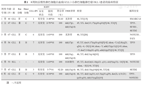 | 7 | 男 | 47 | CLL | Ⅱ | B | 3 | 有突变 | 3-7*01 | 92.20 | del(13q14) | 46, XY, del(13)(q14)[6]/46, XY[4] | SETD2 |