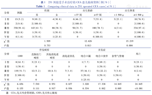 251例接受手术治疗,其中Ⅰ型13例(13/251,5.2%),Ⅱ型2例(2/251,0.8%),Ⅲ型230例(230/251,91.6%),Ⅳ型2例(2/251,0.8%),Ⅴ型4例(4/251,1.6%)。130例伴CHD,15例伴直肠肛门畸形,10例伴其他消化道畸形(十二指肠梗阻、空肠闭锁、幽门前瓣膜),7例伴消化道穿孔。251例接受手术治疗的CEA患儿临床资料见表1。