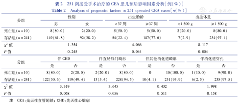 251例接受手术治疗的CEA患儿预后影响因素分析[例(%)]
