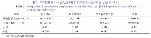 230例Ⅲ型CEA中,123例行胸腔镜手术,107例行经胸膜外入路开胸手术;两种手术治愈率以及吻合口漏、吻合口狭窄、食管气管瘘复发的发生率比较,差异均无统计学意义(P>0.05),见表3。