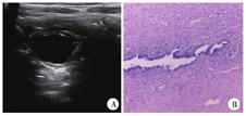 病例2,女,8岁,因体检发现腹部包块1年入院。查体:腹平软,无明显压痛、反跳痛,未触及明显包块。术前B超检查提示回盲部肠壁有一2.5 cm×0.9 cm囊性包块,囊壁可见平滑肌样结构(图2A)。术中腹腔镜检查见回盲部肠系膜缘侧2.5 cm×1.0 cm×1.0 cm憩室样肿块,距离回盲瓣4.5 cm,与正常肠管平列走行,形成双腔管道,近端为盲端,远端与正常肠管相通,为管状型。术后病理检查结果证实为回盲部肠重复畸形(图2B)。