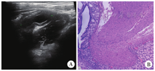 病例1,女,3岁,因腹痛1 d入院。查体:腹平软,右下腹压痛、无反跳痛,未触及包块。术前B超示回盲部近回肠末段肠壁旁1.5 cm×1.2 cm囊性包块,囊壁为平滑肌样结构(图1A)。术中腹腔镜探查见回肠末段近回盲部系膜缘侧有一1.5 cm ×1.5 cm×1.0 cm大小囊性肿块,距离回盲瓣约5 cm,向肠腔内突出,与正常肠管有部分共壁,管腔间无交通,为肠内囊肿型。术后病理检查结果证实为回盲部肠重复畸形(图1B)。