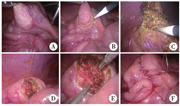 注 A:充分暴露回盲部重复畸形肠管,辨认血供情况;B:分离周围粘连,凝切供应重复畸形肠管的血管,标记预切线;C:按预切线逐层切除病变;D:牵引线悬吊固定;E:5-0可吸收线连续锁边缝合黏膜、黏膜下层;F:5-0可吸收线连续缝合浆肌层