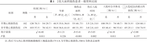 2组患者性别、烧伤总面积、伤后入院时间、入院时合并休克情况比较,差异均有统计学意义(P<0.05);年龄、入院时合并吸入性损伤情况比较,差异均无统计学意义(P>0.05)。见表1。