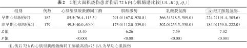 | 非早期心肌损伤组 | 179 | 19.0(14.5,26.5) | 38.0(29.0,51.0) | 70.2(55.7,87.9) | 5.6(4.5,7.4) |