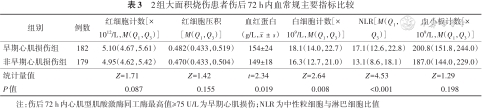 2组大面积烧伤患者伤后72 h内血常规主要指标比较
