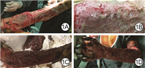 患者平稳度过休克期后使用悬浮床治疗;入院后1周予创面削痂、猪ADM敷料覆盖。入院后2周拟行植皮修复创面时见创面加深及敷料下有大量坏死组织(包括下肢部分肌肉坏死),遂改行清创术。术中及术后反复多次取创面肉芽组织和分泌物标本行微生物培养,结果均为阴性,考虑无菌性坏死(图1)。经清创后创面肉芽组织逐步增生,分别于入院后1.0、1.5、2.0个月行自体皮移植(植皮覆盖部位创面依次为双下肢、双上肢、躯干及部分残余创面),创面基本封闭。