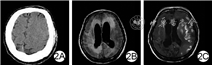 入院后1个月,患者在未使用镇静剂前提下仍昏睡,可唤醒、能遵医嘱完成少量动作,随后再次入睡,颅脑CT未见明显异常,此时未行颅脑磁共振检查;入院后3个月,患者半昏迷,对疼痛有反应,不能遵医嘱完成动作,颅脑磁共振检查示明显脑积水、脑水肿、出血灶、梗死灶;入院后4个月,复查颅脑磁共振示脑积水有所减少,仍存在脑水肿,并出现新软化灶、梗死灶、出血灶。见图2。