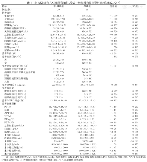 非AKI组和AKI组肝移植供、受者一般资料和临床资料比较[M(Q1,Q3)]