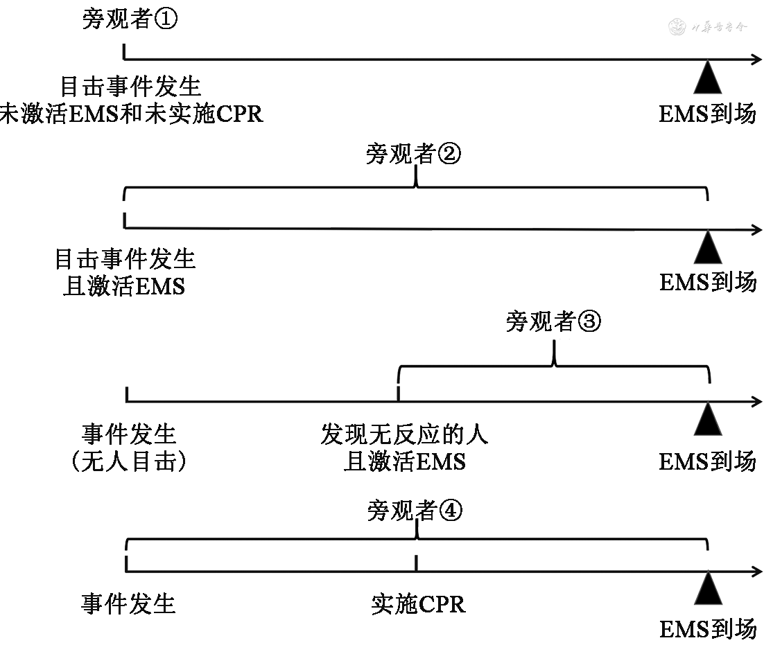 | 目击者 | 看到或听到心脏骤停发生的任何人 | EMS到达现场前看到或听到心脏骤停发生的任何人 |
