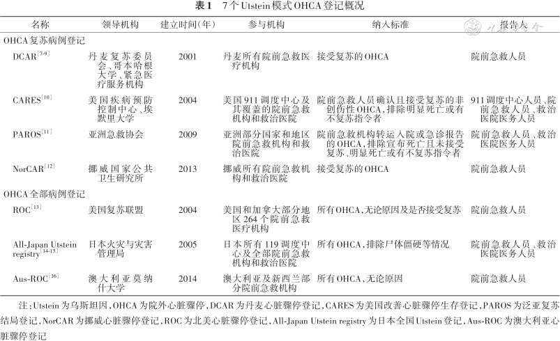 注:Utstein为乌斯坦因,OHCA为院外心脏骤停,DCAR为丹麦心脏骤停登记,CARES为美国改善心脏骤停生存登记,PAROS为泛亚复苏结局登记,NorCAR为挪威心脏骤停登记,ROC为北美心脏骤停登记,All-Japan Utstein registry为日本全国Utstein登记,Aus-ROC为澳大利亚心脏骤停登记