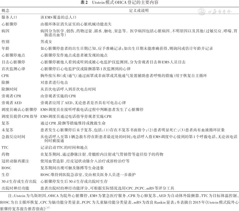 注:Utstein为乌斯坦因,OHCA为院外心脏骤停,EMS为紧急医疗服务,CPR为心肺复苏,AED为自动体外除颤器,TTC为目标体温控制,ROSC为自主循环恢复,CPC为脑功能分类量表,PCPC为儿童脑功能分类量表,mRS为改良Rankin量表;本表摘自2015年《Utstein模式院外心脏骤停复苏报告推荐指南》[17]