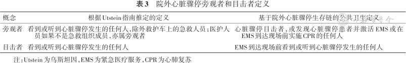Utstein指南的初衷是规范记录院外院内急救过程,经过30年发展,记录规范更加完善,但一些关键定义仍有发展空间[23]。例如,Utstein指南仅列出“旁观者CPR”和“目击心脏骤停”,但并无“旁观者(bystander)”和“目击者(witness)”的直接定义,不同研究间差异甚大:某DCAR研究将旁观者定义为心脏骤停目击者或发现该患者无反应并激活EMS的人[9];某CARES研究将旁观者定义为在场且进行干预但非紧急调度中心的派遣人员[24]。我们依据Utstein指南,在进一步考虑OHCA生存链中事件发生、目击、EMS激活并到场等环节和人员后,从公共卫生干预视角提出“旁观者”的定义:心脏骤停目击者,或发现心脏骤停患者并激活EMS或在EMS到达现场前实施CPR的任何人(表3,图1)。在Utstein指南中,旁观者更倾向于强调非专业人士,“旁观”或“目击”的人不一定去激活EMS和实施CPR,而一旦采取行动,则以“旁观者”冠之。只有未“旁观”的旁观者激活了EMS和现场实施了CPR,患者才有可能坚持到后续高级生命支持的到来。我们的定义进一步突出旁观者在事件中的作用,有助于公众CPR的普及。无论如何,Utstein模式OHCA登记产生了很多高质量科学证据,这些证据为在短暂的抢救时间窗口重启心脏提供了策略和措施支撑,也是以旁观者为基础开展公共卫生干预的依据。