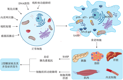 细胞衰老是指细胞受到各种刺激后出现永久性细胞周期停滞的一种状态。细胞衰老是整体衰老的生理基础,也是整体衰老在细胞水平的重要体现[1]。细胞衰老可发生在生命的各个阶段,在机体中常扮演双重角色,一方面具有促进组织修复、调节机体发育、抑制肿瘤等生理作用;另一方面,可导致多种衰老相关性疾病的发生,如动脉粥样硬化、骨质疏松症、肿瘤、糖尿病、神经退行性病变等[2]。2型糖尿病是最常见的衰老相关性疾病之一。据2021年国际糖尿病联盟统计,75~79岁人群2型糖尿病的患病率高达24.0%[3]。在确诊的成人糖尿病中,近一半为老年人群[4]。近年来诸多研究报道,细胞衰老是2型糖尿病发病过程中的关键环节[5]。深入探究细胞衰老与2型糖尿病之间的病理生理联系,或将为2型糖尿病的防治提供新靶点。