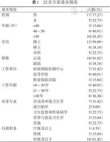 22名咨询专家包括男性17名,年龄大于50岁者10人,博士学位13人,工作年限大于30年8人,工作年限在20~30年5人,正高职称18人,来自疾病预防控制中心、医院和职业病防治院13人,来自不同高校9人(表1)。