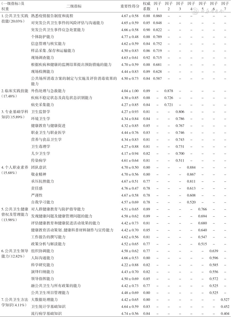 指标体系包含7个一级指标共43个条目。一级指标分别是公共卫生实践技能、临床实践技能、专业基础学科知识、个人职业素养、公共卫生健康曾权及管理能力、公共卫生领导能力、公共卫生方法学知识。其权重系数(%)依次是20.03、17.48、15.89、15.68、13.98、12.82和4.11;重要性得分最高的要素是个人防护、责任感及敬业精神。