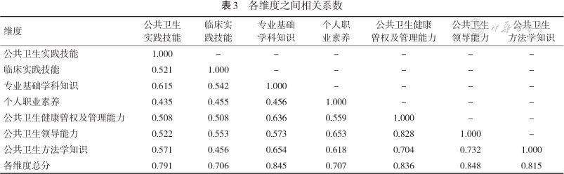 公共卫生实践技能维度与专业基础学科知识维度的相关程度较高(r=0.615),而公共卫生健康曾权及管理能力维度与公共卫生领导能力的相关程度高(r=0.828)(表3)。