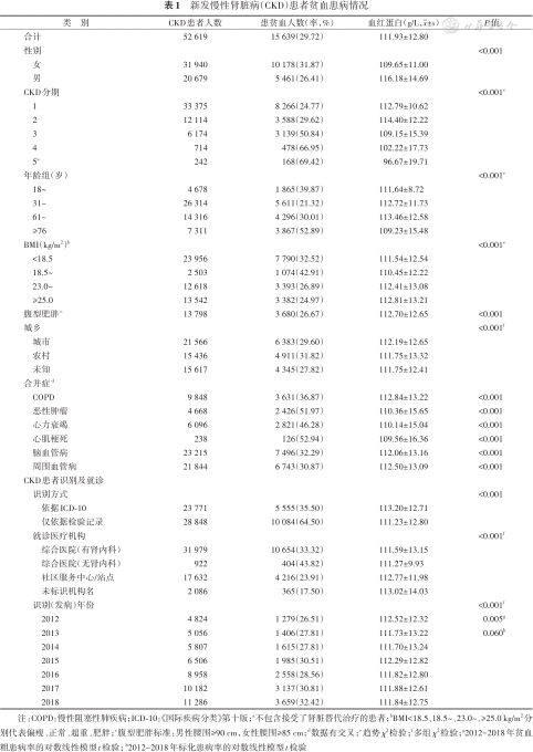注:COPD:慢性阻塞性肺疾病;ICD-10:《国际疾病分类》第十版;a不包含接受了肾脏替代治疗的患者;bBMI<18.5、18.5~、23.0~、≥25.0 kg/m2分别代表偏瘦、正常、超重、肥胖;c腹型肥胖标准:男性腰围≥90 cm,女性腰围≥85 cm;d数据有交叉;e趋势χ2检验;f多组χ2检验;g2012-2018年贫血粗患病率的对数线性模型t检验; h2012-2018年标化患病率的对数线性模型t检验