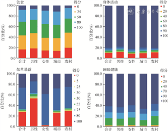 3. 健康行为得分分布:我国成年居民饮食和烟草暴露的得分分别为46.0(95%CI:44.7~47.3)、61.4(95%CI:60.6~62.2)。在饮食方面,女性[49.1(95%CI:47.7~50.6)]的得分高于男性[42.9(95%CI:41.6~44.1)],得100分者仅占8.1%(95%CI:7.2%~9.0%),得0分者占16.5%(95%CI:15.2%~17.9%),得25分者占26.7%(95%CI:25.5%~27.9%),男性[6.5%(95%CI:5.8%~7.3%)]和农村居民[4.7%(95%CI:4.0%~5.4%)]得100分者占比低于平均水平[8.1%(95%CI:7.2%~9.0%)]。在烟草暴露方面,男性[37.1(95%CI:35.9~38.3)]的得分显著低于女性[85.8(95%CI:85.4~86.2)],男性得100分者仅占14.5%(95%CI:13.4%~15.7%),得0分者占52.8%(95%CI:51.3%~54.4%),女性得80分者占58.7%(95%CI:57.0%~60.3%)。身体活动和睡眠健康的得分分别为86.7(95%CI:85.8~87.5)和85.6(95%CI:85.1~86.0),睡眠健康得分为100分占61.8%(95%CI:60.6%~63.0%)。见图1,2。