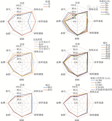 本研究显示,女性的心血管健康状况优于男性,与既往研究一致[9,11],这种性别差异可能由于女性的烟草暴露、BMI以及饮食等指标优于男性[3,18, 19]。城市居民心血管健康评分较高者占比高于农村,这可能是由于城市地区的健康生活方式和经济发展水平较高[11,20]。西南地区居民的心血管健康评分最低,且评分较高者占比最低,而西北地区居民的评分最高,且评分较高者的占比最高,这与既往研究结果不同[9,11],可能是加入了睡眠指标以及采用了新的评分方法[12]。此外,家庭人均年收入越高,评分较高的占比越高,在文化程度等方面也存在差异,结果与既往研究相似[11,21],其原因可能是由于健康食品、体育锻炼场所、经济地位以及医疗保健等社会决定因素存在差异所导致[12,22]。因此,应重视社会决定因素对心血管健康的影响。