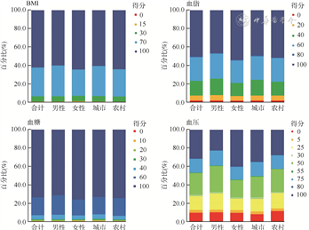4. 健康因素得分分布:我国成年居民BMI、血脂和血糖得分较高。BMI的得分为86.0(95%CI:85.5~86.4),男性[85.4(95%CI:84.8~86.1)]低于女性[86.5(95%CI:86.1~86.9)],BMI得70分和100分者占比较高。血脂的得分为73.8(95%CI:73.1~74.5),得100分者[50.3%(95%CI:48.9%~51.7%)]占比最高,男性得100分者占比[46.6%(95%CI:44.6%~48.7%)]低于平均水平[50.3%(95%CI:48.9%~51.7%)]。血糖的得分为87.5(95%CI:86.9~88.1),女性[88.5(95%CI:87.9~89.1)]高于男性[86.5(95%CI:85.8~87.2)]。我国成年居民血压得分为59.4(95%CI:58.2~60.6),女性[64.3(95%CI:63.2~65.4)]高于男性[54.6(95%CI:53.1~56.0)],得100分者占31.5%(95%CI:29.8%~33.2%),男性[22.8%(95%CI:20.9%~24.6%)]和农村[27.8%(95%CI:26.3%~29.2%)]得100分者占比低于平均水平[31.5%(95%CI:29.8%~33.2%)]。女性的绝大多数指标得分均优于男性;随着家庭人均年收入和文化程度的增加,大多数指标得分呈上升趋势;随着年龄的增加,大多数指标得分呈下降趋势。见图2,3。