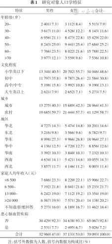 1. 人口学特征:共纳入70 093人,其中男性32 960人(47.0%),女性37 133人(53.0%),城市28 964人(41.3%),农村41 129人(58.7%),心血管病患者5 026人(7.2%)。见表1。