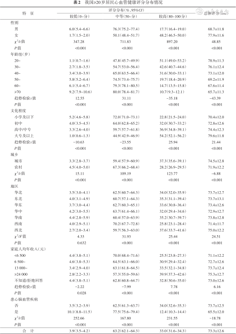 我国约三分之二的成年居民的心血管健康状况有待改善,饮食、烟草暴露和血压是需要重点关注和干预的影响我国居民的心血管健康的因素,男性、农村居民以及社会经济地位较低者是心血管健康促进的重点人群。