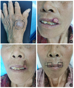 患者为73岁女性,发现左手背结节1年,手术切除后2周复发,扩大切除后组织病理诊断符合角化棘皮瘤型高分化鳞状细胞癌。术后3 d唇部相继发现数个圆形结节,部分皮损中央可见火山口样凹陷,组织病理学示角化棘皮瘤。给予阿维A胶囊口服3个月,皮损消退。随访6个月无复发。