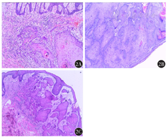体格检查:系统查体无明显异常。皮肤科查体:左手背可见隆起型皮色圆形结节,大小约1 cm×1 cm,边界清晰,质地较硬,中央有"火山口"样凹陷,表面覆白色鳞屑,无破溃,无明显毛细血管扩张(图1A)。实验室检查:血常规、肝肾功能、血脂、肿瘤标志物均未见明显异常。距肿瘤边缘1 cm行扩大切除,术后病理示:表皮棘层明显增生肥厚并向真皮内浸润生长,瘤体中央漩涡状角化物聚集,细胞排列紊乱,可见核分裂象及角化不良细胞,真皮内可见少许鳞状细胞团块,切缘未见肿瘤细胞(图2A)。诊断为KA型高分化SCC。术后3 d患者上唇出现一绿豆粒大小结节,生长迅速,1周内增大至直径约1 cm,中央凹陷,表面毛细血管扩张(图1B)。完整切除后组织病理学诊断为KA(图2B)。术后12 d切口右侧出现一黄豆粒大小结节(图1C),再次切除组织病理仍提示KA(图2C)。术后22 d再次发现上唇2个孤立性绿豆大小结节,中央略为凹陷,外观与之前皮疹类似(图1D)。考虑患者唇部不断有新发皮损且皮损有增大倾向,多次切除影响唇部外观,遂给予阿维A胶囊20 mg午餐时口服。电话随访患者,用药2周后皮损较前缩小,2个月后皮损消退。阿维A减量为10 mg继续口服1个月后停药。用药期间患者自觉唇部干燥不适,外用润唇膏后好转。复查肝肾功能及血脂基本正常。随访6个月无复发。