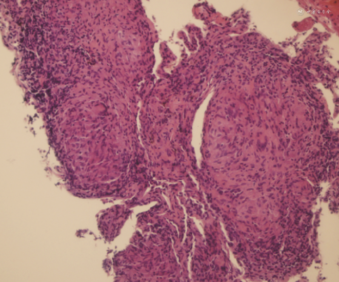 入院后查血常规:淋巴细胞计数1.057×109/L(正常参考值1.10~3.20×109/L),余正常;九项呼吸道感染病原体IgM抗体:抗肺炎支原体IgM抗体(+);肿瘤标志物:神经元特异性烯醇化酶(NSE)36.20 μg/L(正常参考值≤20.0 μg/L);抗核抗体谱:抗SSA抗体(+++),抗Ro-52抗体(+++);抗核抗体:核颗粒型1∶320(+)。大小便常规、肝肾功能、静脉血葡萄糖、电解质、凝血功能、细胞免疫功能、感染性疾病筛查均正常。血清(1,3)-β-D葡聚糖(G试验)、半乳甘露聚糖(GM试验)、抗中性粒细胞胞质抗体(ANCA)以及诱导痰细菌和真菌涂片及培养、抗酸杆菌涂片均为阴性。新型冠状病毒核酸阴性。床旁心电图:窦性心律,正常心电图。胸部CT:双肺多发大小不等斑片影,中央为磨玻璃密度影,边缘为环状高密度影,呈反晕征;病灶内可见多发微结节堆积,呈结节状反晕征(图1, 2, 3, 4, 5, 6)。支气管镜检查:支气管黏膜呈炎症表现,气管腔内可见少许白色泡沫痰,未见狭窄及新生物。双上肺BALF送检细菌和真菌培养、涂片查抗酸杆菌、分枝杆菌核酸(TB/NTM-DNA)和Xpert MTB/RIF均为阴性;BALF液基制片:未查见癌瘤细胞。于右上叶后段行黏膜活检术,病理示黏膜慢性炎症。(2023年2月22日)行CT引导下左上肺病灶穿刺活检术,病理示慢性肉芽肿性炎(图7),未查见抗酸杆菌。患者有口干症状,抗SSA抗体、抗Ro-52抗体强阳性,考虑干燥综合征可能,给予完善唇腺活检,病理示:送检唇腺内查见淋巴组织浸润>1灶,活检分级为Ⅳ级。患者干燥综合征诊断明确,但双肺多发反晕征是由活动性肺结核还是干燥综合征继发机化性肺炎(OP)导致仍不能确定。多学科诊疗团队(MDT)讨论后认为:患者青年男性,免疫功能正常,肺部病变以双上肺分布为主,表现为多发反晕征伴微结节堆积,与典型OP环壁光滑的反晕征不符,且TSPOT.TB呈阳性,病理见肉芽肿形成,高度怀疑为活动性肺结核;但结节病、干燥综合征继发的其他肺损害亦不能完全排除,建议病理组织完善结核分枝杆菌聚合酶链反应(TB-PCR)检测,必要时在征得患方同意后可予诊断性抗结核治疗。(2023年3月1日)病理组织外送TB-PCR(成都中医药大学附属医院):TB-DNA(+)。最终诊断:活动性肺结核合并干燥综合征。因患者无多系统受累表现,故仅给予标准四联方案抗结核治疗,未使用糖皮质激素或免疫抑制剂,嘱其至传染病医院及风湿免疫科门诊随诊。1个月后电话随访患者,诉其正接受抗结核治疗。遗憾的是,目前未能与患者取得再次联系,故未能知晓其治疗转归。