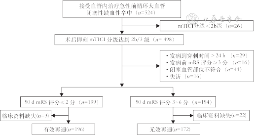 血管内治疗已经成为急性大血管闭塞性缺血性卒中(acute ischemic stroke with large vessel occlusion,AIS-LVO)最有效的治疗手段,其能够显著提高血管再通率,改善临床预后,被各国指南一致推荐[1, 2]。随着血管内治疗技术不断成熟以及器械的不断更新,血管成功再通率已达80%以上[3]。但是,较高的血管再通并未带来理想的临床结局,良好预后率只有32%~46%[3, 4, 5, 6, 7, 8],仍有约60%的患者为无效再通[9],即血管内治疗后闭塞血管成功再通,但90 d的临床结局尚不能达到功能独立。因此,本研究拟探讨AIS-LVO患者血管内治疗后无效再通的影响因素,旨在帮助筛选合适的患者进行干预。