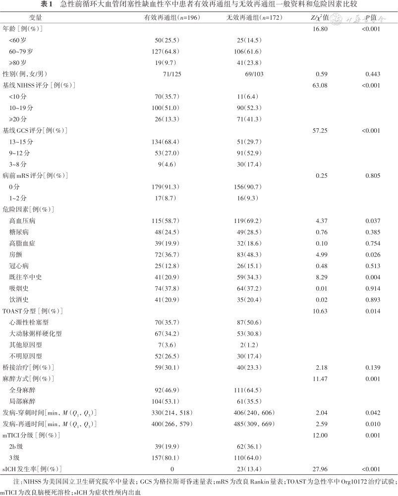 | 变量 | 有效再通组(n=196) | 无效再通组(n=172) | Z/χ2值 | P值 |