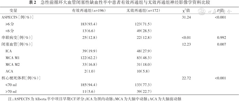 | 变量 | 有效再通组(n=196) | 无效再通组(n=172) | χ2值 | P值 |