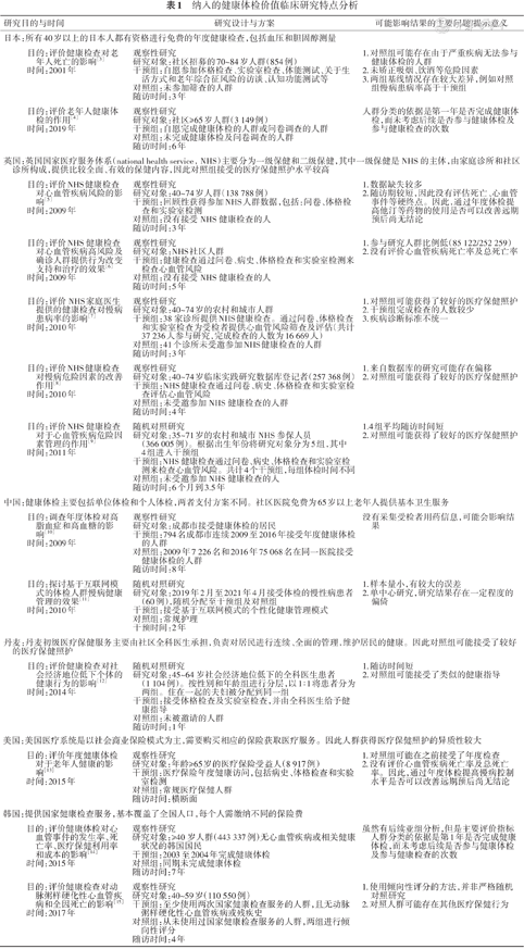 本研究入选关于健康体检价值的临床研究,从研究对象的选取、干预内容、随访方案、终点事件的判断等方面进行分析,思考是否能达到研究目的,且具有良好的外推性(表1)。文献入选过程如下:通过使用general health check-up、primary intervention、annual physical examination、well-care visit和primary prevention or screening关键词在PubMed、CINAHL、EMBASE和Google Scholar数据库进行检索,并且手动搜索近期的综述和检索到的论文中的参考文献列表来确定额外的文献。搜索限制在2000到2022年发表的英文出版物。由两名研究作者对文献进行筛选,当1名作者不同意将一项研究纳入综述时,所有作者对文章进行阅读,并共同作出决定。