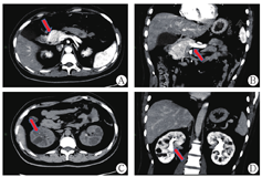 注:图中箭头所示胰腺发育缺陷,胰体、胰尾缺失,双肾多发囊肿