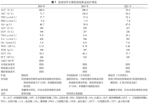 本例患者通过HNF1B基因检测明确诊断为RCAD。与既往文献报道不同的是,本例患者并不是以糖尿病为首发症状,而是以转氨酶升高、胆汁淤积及高血红蛋白为首发表现,随后出现血糖及尿酸升高表现,但其特别的胰腺缺陷及肾囊肿表现,在既往诊治中被忽视,未能提早诊断。到目前为止,HNF1B基因缺陷的肝脏和胆道表型仅在单个患者中得到确认,多为儿童[4,5],多为胆汁淤积、胆道闭锁[3]或胆道囊肿[4,5,6]。另外患者高血红蛋白,多次骨穿刺检查及JAK2基因阴性,除外原发性真红细胞增多症。而HNF1B基因缺陷是否引起高血红蛋白在既往鲜见相关报道。