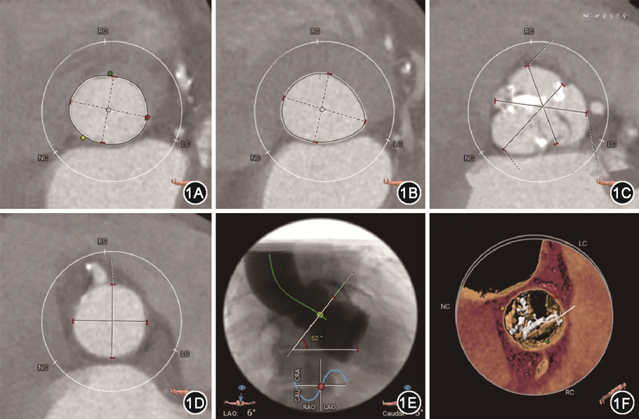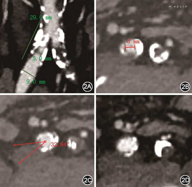 患者男性,67岁,因“反复活动后胸闷、气喘3个月余”于2022年10月7日入院。患者3个月来反复出现活动时胸闷、气喘,药物治疗效果不佳,症状逐渐加重。既往有高血压和糖尿病病史10余年。入院体格检查:血压110/68 mmHg(1 mmHg=0.133 kPa),心率80次/min,律齐,胸骨左缘3、4肋间可闻及4/6收缩期喷射样杂音。N末端B型利钠肽原1 336.0 ng/L(参考值0~100 ng/L),心肌酶、肌钙蛋白未见明显异常。超声心动图提示主动脉重度狭窄并轻度关闭不全(最大压差94 mmHg,平均压差53 mmHg,峰值流速4.84 m/s),左心室舒张期末径50 mm,左心室收缩期末径28 mm,左心室后壁厚度12 mm,射血分数73%,少量心包积液,左心室舒张功能减退。术前主动脉CT血管成像(CTA)提示功能性二叶瓣(Type Ⅰ型),瓣叶增厚,中度钙化,左右部分融合,左冠状动脉开口高约11.7 mm,右冠状动脉开口高约16.9 mm,法式窦结构可,窦管交界高约20.2 mm、直径约26.4 mm,心脏角度约52°,升主动脉未见明显扩张(图1)。术前髂动脉CTA提示双侧髂动脉走行迂曲。右髂总动脉近段弥漫性严重钙化,病变斑块长度>20 mm,右髂总动脉直径9 mm(图2A),最狭窄处直径5 mm(图2B),狭窄率接近70%,接近270°环形钙化(图2C)。左髂总动脉近段闭塞伴严重钙化(图2D)。