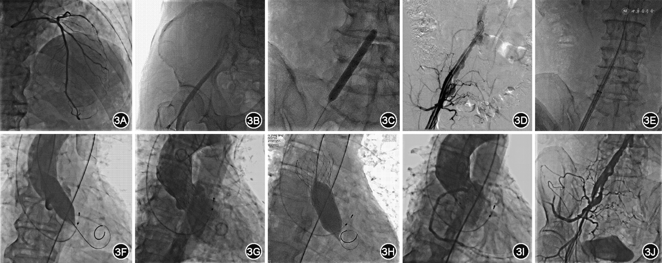 2022年10月10日患者局麻+适当镇静下行经皮冠状动脉造影术+经皮选择性右髂总动脉球囊扩张术(Shockwave冲击波球囊)+升主动脉造影术+临时起搏器植入术+经皮主动脉瓣扩张术+TAVR。患者取平卧位,穿刺左桡动脉测量动脉压,穿刺右颈内静脉作为补液入路,取右股动脉、右桡动脉及左锁骨下静脉为穿刺血管,常规消毒铺布,以1%利多卡因15 ml分别局部麻醉各穿刺点,以改良Seldinger′s术穿刺左锁骨下静脉,置入6 F动脉鞘,经左锁骨下静脉将临时起搏器电极送至右心室心尖部,测试起搏器起搏良好。以相同的方法穿刺右桡动脉,置入6 F动脉鞘。以5 F TIG-4.0左右共用造影导管及5 F JL造影导管分别行左、右冠状动脉造影,结果显示冠状动脉右优势型,左冠状动脉主干末端有30%局限性狭窄,左前降支中段有20%狭窄,第一对角支开口局限70%狭窄,心肌梗死溶栓试验(TIMI)血流3级(图3A);回旋支无明显狭窄,TIMI血流3级;右冠状动脉近段局限60%狭窄,TIMI血流3级。在透视下以改良Seldinger′s术成功穿刺右侧股总动脉,置入6 F股动脉鞘,预埋2把proglide缝合器,并更换8 F股动脉鞘,X线下由右侧股动脉鞘管送入6 F猪尾造影导管至腹主动脉右髂总动脉开口处行腹主动脉造影,提示右髂总动脉近段有弥漫性55%狭窄,合并近270°严重钙化(图3B)。随后利用Shockwave冲击波球囊行经皮选择性右髂总动脉球囊扩张术。首先,经8 F股动脉鞘,送SION blue导丝通过右髂总动脉近段的局限性狭窄病变达腹主动脉,然后用7.0 mm×60 mm Shockwave冲击波球囊(健适医疗,中国上海)先后以4、6 atm(1 atm=101.325 kPa)的压力分别对右髂总动脉近段进行微波震荡约20 s(图3C)。复查造影提示右髂总动脉残余狭窄30%,钙化影减轻,无造影剂滞留或外漏,未见夹层影像学改变(图3D)。X线下由右侧桡动脉鞘管送入6 F猪尾造影导管至主动脉根部行升主动脉造影,了解主动脉瓣、冠状动脉和主动脉弓形态,然后经右侧股动脉鞘管经Lungderquist特硬导丝引导更换为GORETM 20 F导引鞘(图3E),经右侧股动脉送入AL2造影导管至升主动脉,在直头导丝引导下跨瓣成功,交换J型导丝,再送入6 F猪尾导管至左心室,测量左心室压力为240/3 mmHg,升主动脉压力150/66 mmHg,跨瓣压差为90 mmHg,交换Lungderquist特硬导丝至左心室,撤出猪尾导管。临时起搏器以5 V、150~180次/min频率起搏控制性降压,用直径为23 mm球囊预扩张主动脉瓣,扩张同时行主动脉根部造影,结果显示主动脉瓣处无明显反流,冠状动脉血流未受影响(图3F)。退出球囊,送入29 A的Venus Plus主动脉瓣支架(启明医疗,中国杭州),成功跨瓣后精确定位,缓慢释放瓣膜支架前1/3,并在临时起搏器以180次/min频率起搏控制血压下逐步精确释放主动脉瓣膜支架。复查升主动脉造影,见人工主动脉瓣贴壁不良,未见内漏,但有中度瓣周漏(图3G)。因瓣膜释放后有中度瓣周漏,透视下可见瓣膜褶皱,遂用25号球囊后扩张(图3H)。复查升主动脉造影,见人工主动脉瓣贴壁良好,未见内漏及瓣周漏,左右冠状动脉开口均未受影响,显影良好(图3I)。再次测量左心室压力为146/18 mmHg,升主动脉压力143/63 mmHg,跨瓣压差为3 mmHg,同时行经胸超声心动图检查证实置入的主动脉瓣工作良好,无明显反流现象。最后撤出股动脉鞘,复查造影入路未见损伤(图3J)。