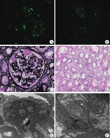 注:A:C3(2+~3+)节段分布在系膜区和毛细血管袢,颗粒样沉积(免疫荧光 ×200);B:C4(+~2+)弥漫分布在系膜区和毛细血管袢,颗粒样沉积(免疫荧光 ×200);C:光镜下,局灶节段性内皮细胞增生、肿胀,足细胞节段性增生,毛细血管袢腔内可见血浆蛋白渗出,肾小球基底膜节段性增厚伴变性(PASM染色 ×400);D:光镜下,肾小管间质水肿(HE染色 ×400);E:系膜区可见较多团块状低电子密度沉积物,内皮细胞增生、内皮下少量电子致密物,上皮细胞足突偶见融合(电镜 ×3 000);F:基底膜内疏松层增宽(电镜 ×5 000)