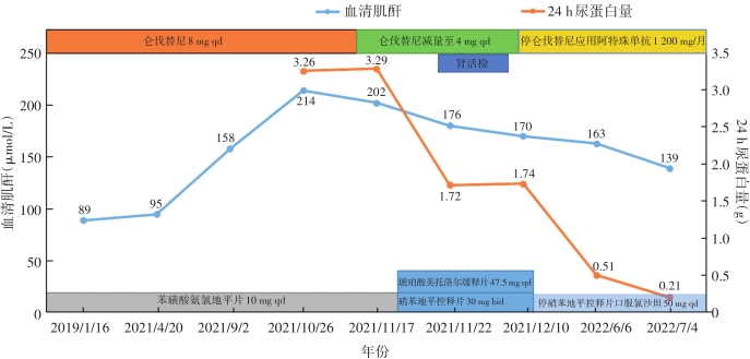 出院后随诊情况:血压持续改善,水肿基本消失,食欲和精神均改善。2021年12月13日复诊测血压126/75 mmHg,停用硝苯地平控释片、单药氯沙坦50 mg qd控制血压仍满意;血生化:Alb 32 g/L,Scr 170 μmol/L,尿素氮11.55 mmol/L,血钾4.6 mmol/L;24 h尿蛋白量2.03 g。2021年12月15日再次应用阿特珠单抗1 200 mg,此后每月规律应用阿特珠单抗1 200 mg 1次。2022年6月6日复诊,查Scr 163 μmol/L,24 h尿蛋白量0.51 g。2022年7月4日随诊复查Scr 139 μmol/L,24 h尿蛋白量0.21 g。随访Scr及24 h尿蛋白量变化见图2。