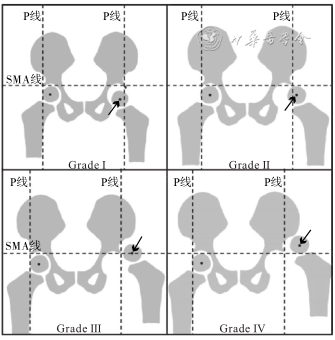 Tönnis分型是基于股骨头骨化核与髋臼的相对位置进行分型:过髋臼外上缘作双侧髋臼外上缘连线(superolateral margin of the acetabulum,SMA)的垂线为Perkins线(P线),SMA线与P线垂直相交形成四个象限。股骨头骨化核位于内下象限为Ⅰ度、位于外下象限为Ⅱ度、与SMA线接触为Ⅲ度、位于外上象限为Ⅳ度(图1)。