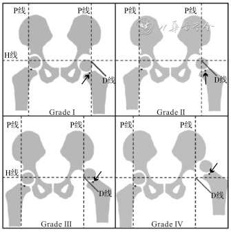由于DDH患儿股骨头骨化核出现延迟,并且存在偏心可能,IHDI提出了基于股骨近端干骺端中心与髋臼相对位置的分型系统。IHDI分型:双侧Y形软骨上方髂骨下缘的连线为Hilgenreiner’s线(H线),过髋臼外上缘做Hilgenreiner’s线的垂线为Perkins线(P线),二者构成的外下象限的角平分线为D线。股骨近端干骺端中点位于P线的内侧或P线上为Ⅰ度、位于P线之外但不超过D线之间为Ⅱ度、位于D线之外但不超过H线之间为Ⅲ度、位于H线之上为Ⅳ度(图2)。